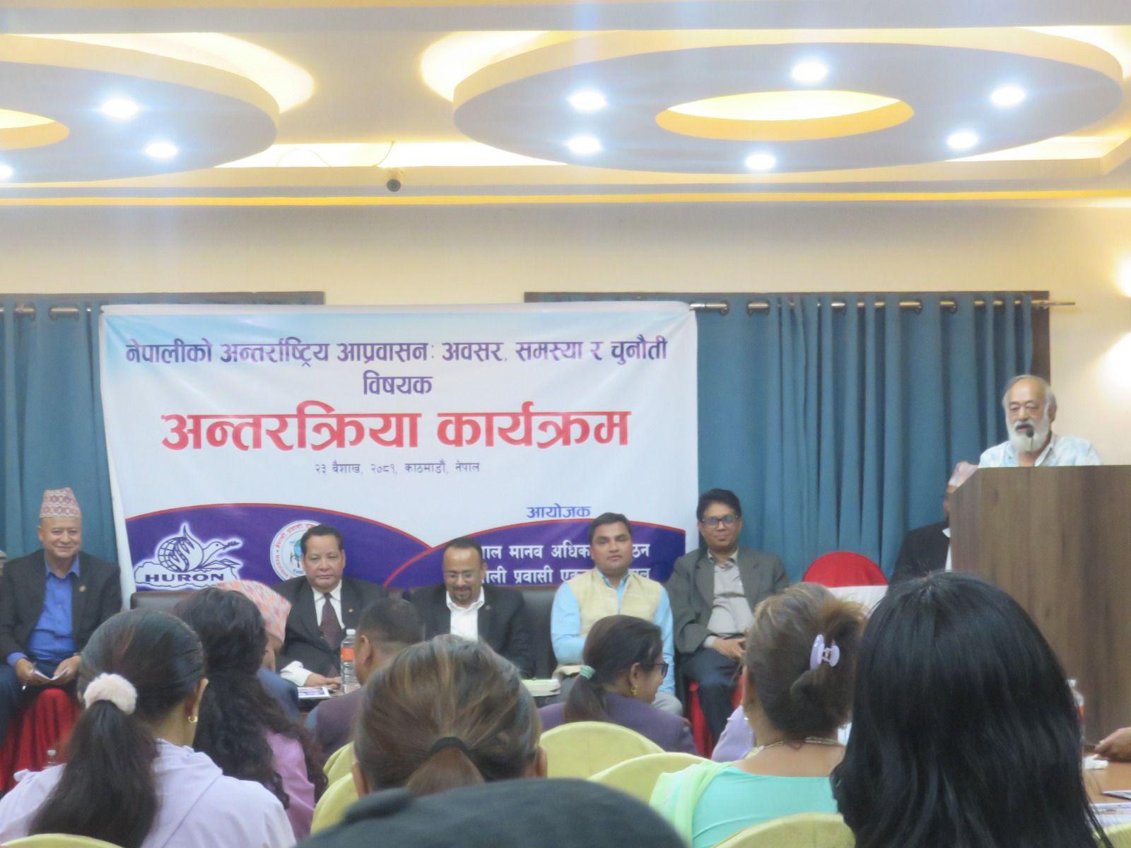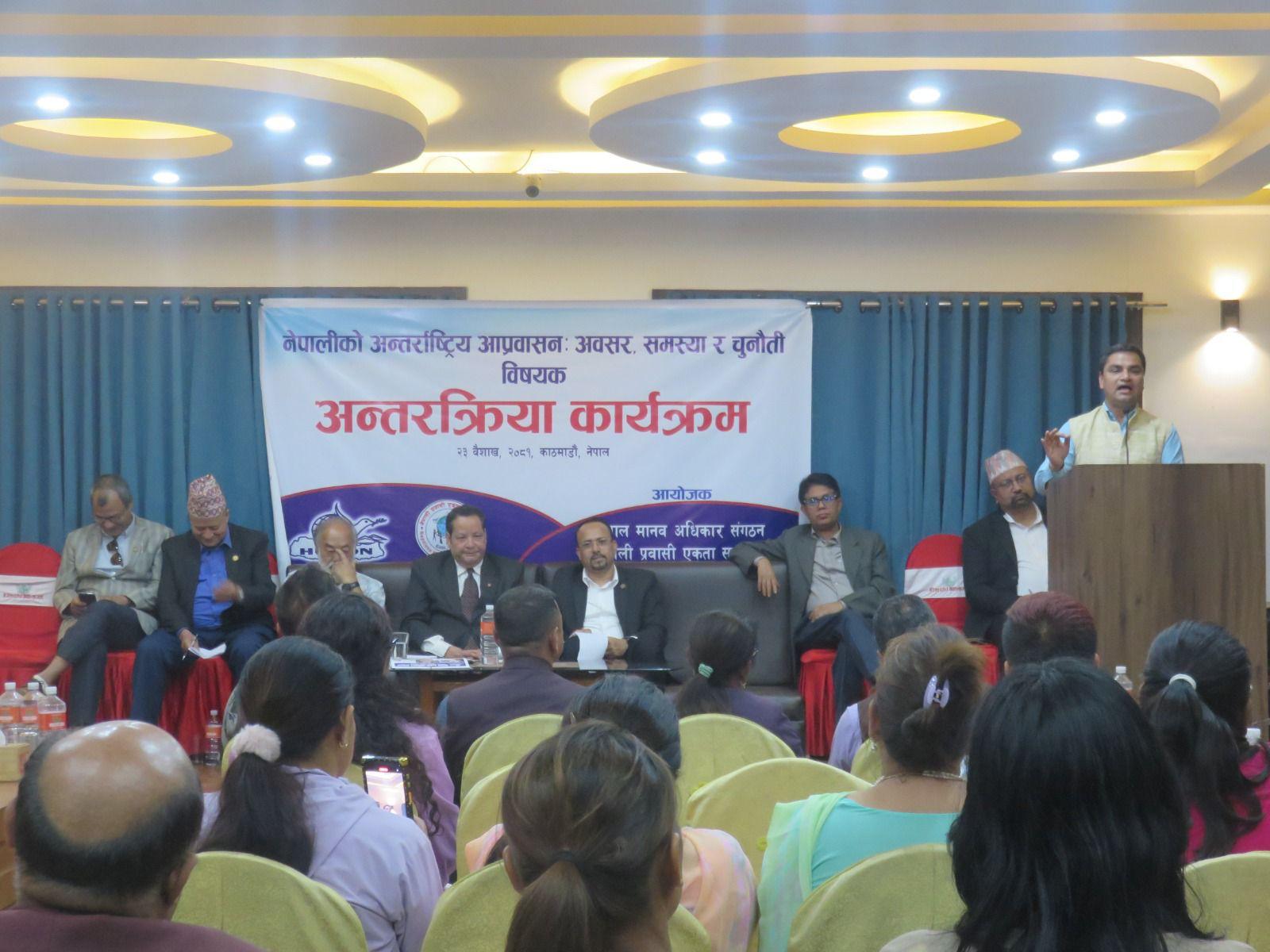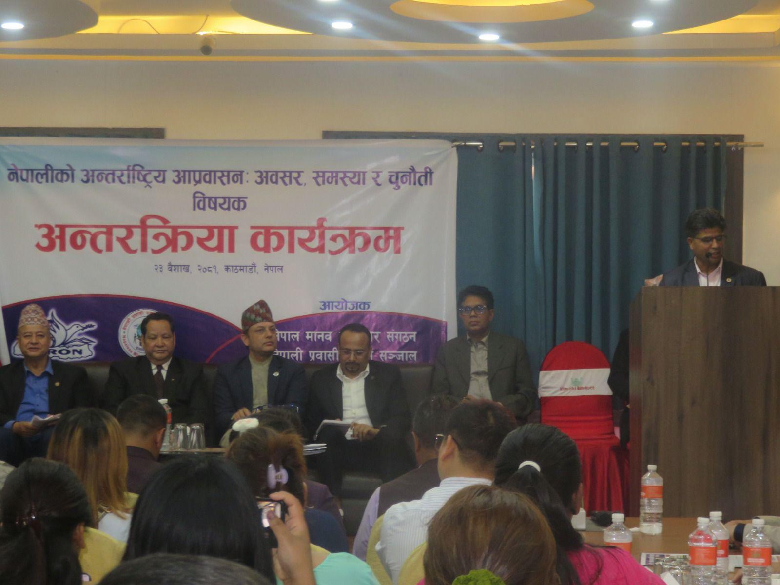 नेपाल मानव अधिकार संगठन र नेपाली प्रवासी एकता सञ्जालको संयुक्त आयोजनामा मिति २०८१ साल बैशाख २३ गते “नेपालीको अन्तर्राष्ट्रिय आप्रवासनः अवसर, समस्या र चुनौती” विषयक अन्तरक्रिया कार्यक्रम अनामनगरस्थित किम्चि रेष्टुरेन्ट एण्ड बेन्क्वेटमा सम्पन्न भयो । कार्यक्रमको सभापतित्व संगठनका अध्यक्ष इन्द्र प्रसाद अर्यालले गर्नुभएको थियो भने कार्यक्रमको प्रमुख अतिथि माननीय श्रम, रोजगार तथा सामाजिक सुरक्षा मन्त्री डि.पि.अर्याल हुनुहुन्थ्यो । कार्यक्रममा राष्ट्रिय मानव अधिकार आयोगका सचिव मुरारि प्रसाद खरेल, फ्रान्सका लागि पूर्व नेपाली राजदुत तथा सेन्टर फर डिप्लोमेसीका अध्यक्ष मोहन कृष्ण श्रेष्ठ, माननीय प्रदिप पौडेल, नेपाल मानव अधिकार संगठनका पूर्व अध्यक्षहरु प्रा.कपिल श्रेष्ठ, सुदिप पाठक, महामुनीश्वर आचार्य, संगठनका पदाधिकारीहरु, केन्द्रीय सदस्यहरु, विभिन्न जिल्लाका सभापतिहरु, मानव अधिकारवादी, नागरिक समाज, पत्रकार लगायतको सहभागिता थियो । ७९ जनाको सहभागिता रहेको कार्यक्रमको सञ्चालन संगठनका महासचिव कल्याण पोख्रेलले गर्नुभएको थियो ।