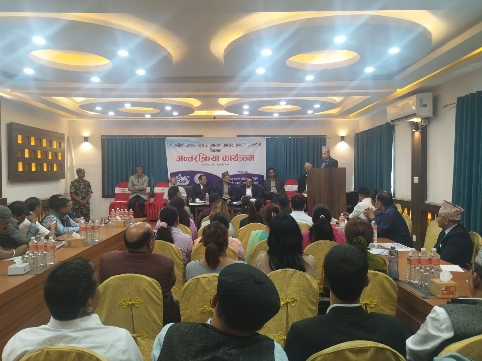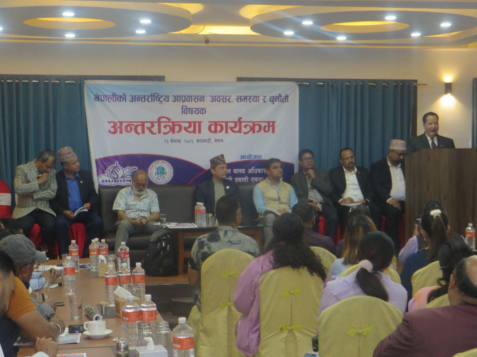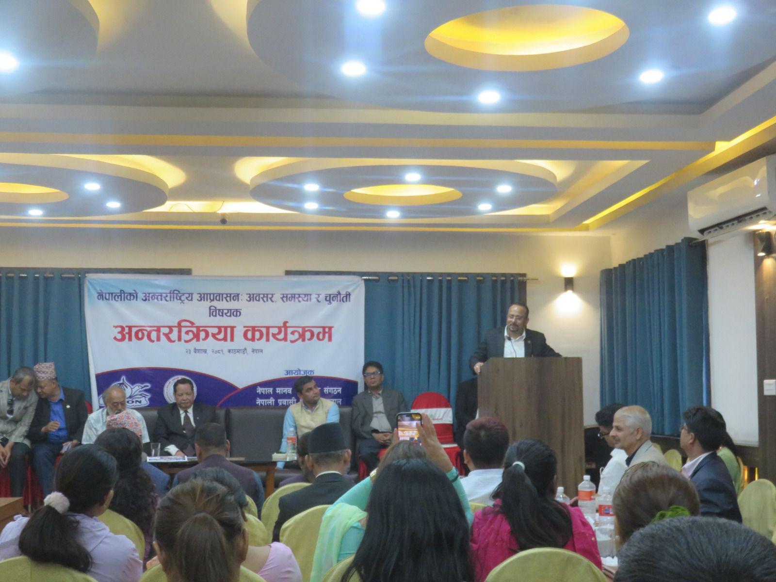 नेपाल मानव अधिकार संगठन र नेपाली प्रवासी एकता सञ्जालको संयुक्त आयोजनामा मिति २०८१ साल बैशाख २३ गते “नेपालीको अन्तर्राष्ट्रिय आप्रवासनः अवसर, समस्या र चुनौती” विषयक अन्तरक्रिया कार्यक्रम अनामनगरस्थित किम्चि रेष्टुरेन्ट एण्ड बेन्क्वेटमा सम्पन्न भयो । कार्यक्रमको सभापतित्व संगठनका अध्यक्ष इन्द्र प्रसाद अर्यालले गर्नुभएको थियो भने कार्यक्रमको प्रमुख अतिथि माननीय श्रम, रोजगार तथा सामाजिक सुरक्षा मन्त्री डि.पि.अर्याल हुनुहुन्थ्यो । कार्यक्रममा राष्ट्रिय मानव अधिकार आयोगका सचिव मुरारि प्रसाद खरेल, फ्रान्सका लागि पूर्व नेपाली राजदुत तथा सेन्टर फर डिप्लोमेसीका अध्यक्ष मोहन कृष्ण श्रेष्ठ, माननीय प्रदिप पौडेल, नेपाल मानव अधिकार संगठनका पूर्व अध्यक्षहरु प्रा.कपिल श्रेष्ठ, सुदिप पाठक, महामुनीश्वर आचार्य, संगठनका पदाधिकारीहरु, केन्द्रीय सदस्यहरु, विभिन्न जिल्लाका सभापतिहरु, मानव अधिकारवादी, नागरिक समाज, पत्रकार लगायतको सहभागिता थियो । ७९ जनाको सहभागिता रहेको कार्यक्रमको सञ्चालन संगठनका महासचिव कल्याण पोख्रेलले गर्नुभएको थियो ।