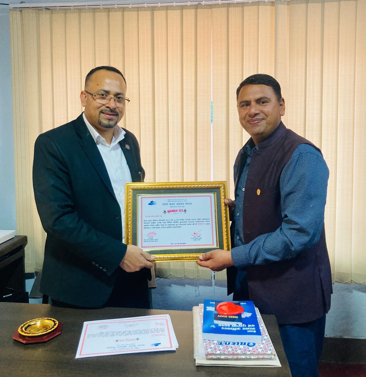 नेपाल मानव अधिकार संगठन जिल्ला शाखा काभ्रेपलाञ्चोकद्वारा सम्मान पत्र प्रदान गर्दै बाग्मती प्रदेश संयोजक एवं काभ्रेपलाञ्चोक जिल्ला शाखा सभापति राजु सिग्देल