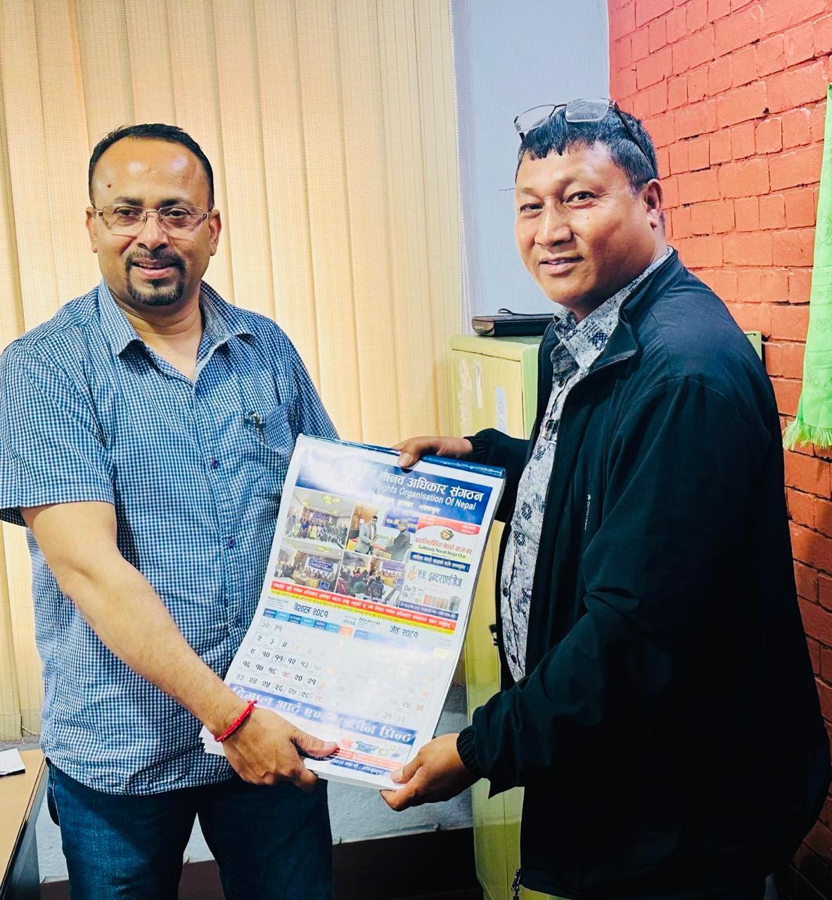 नेपाल मानव अधिकार संगठन जिल्ला शाखा भक्तपुरद्वारा क्यालेन्डर हस्तान्तरण गर्दै भक्तपुर जिल्ला शाखा सभापति रामकृष्ण मानन्धर
