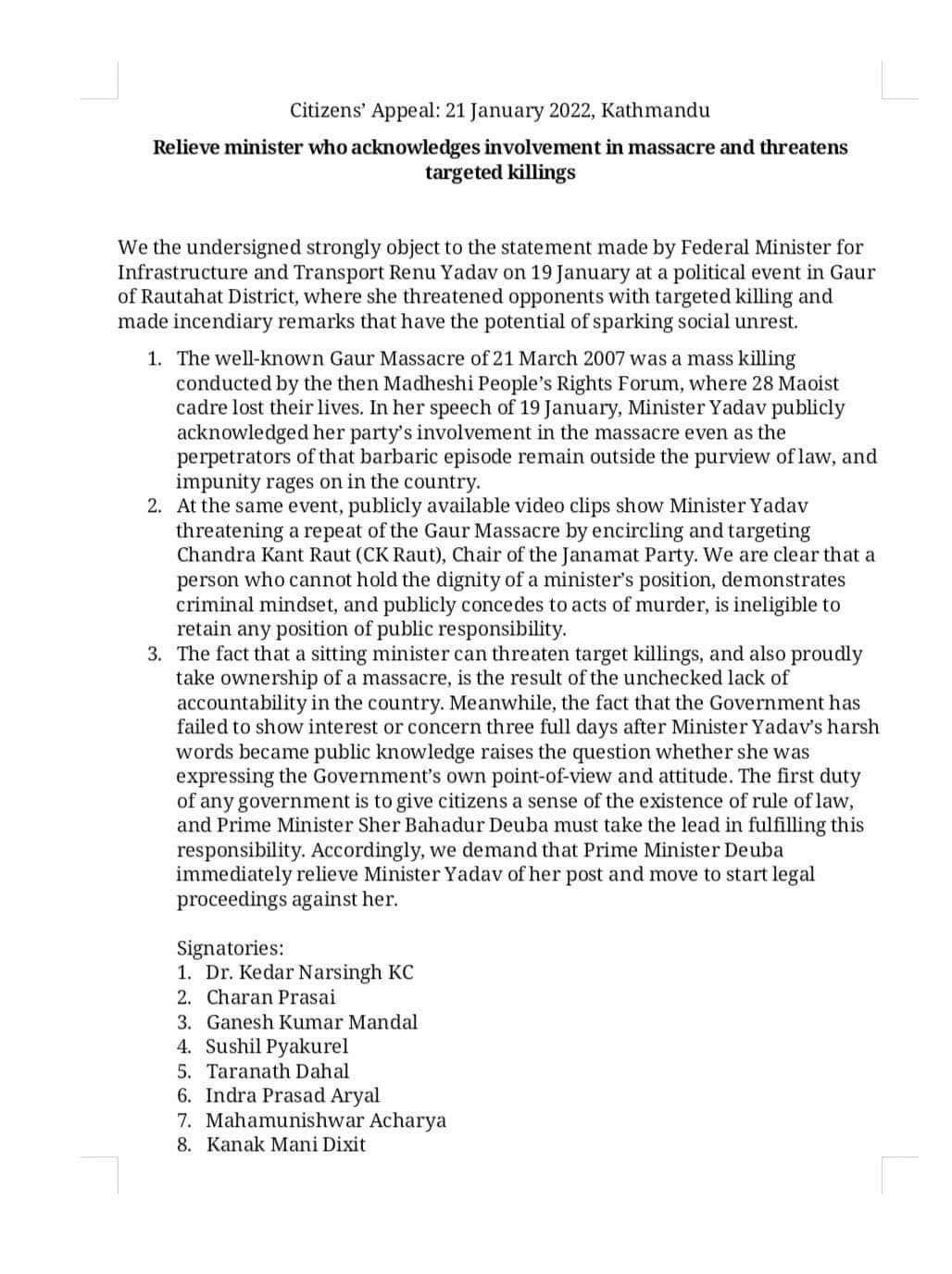 वास्तविक हत्यारा र बलात्कारीलाई पक्राउ गरी कारबाही गर्न संगठनको माग