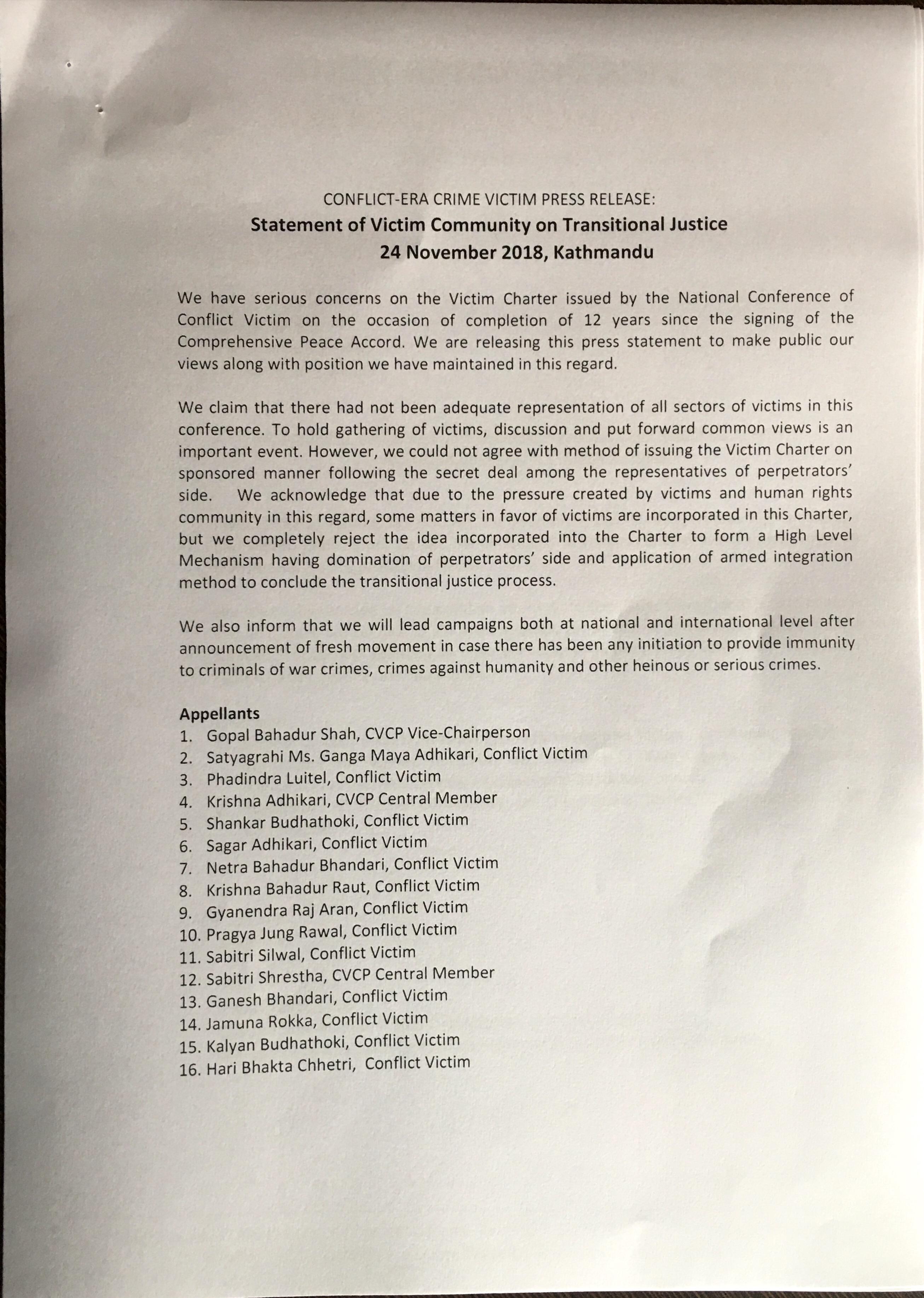 Statement of victim community on Transitional Justice