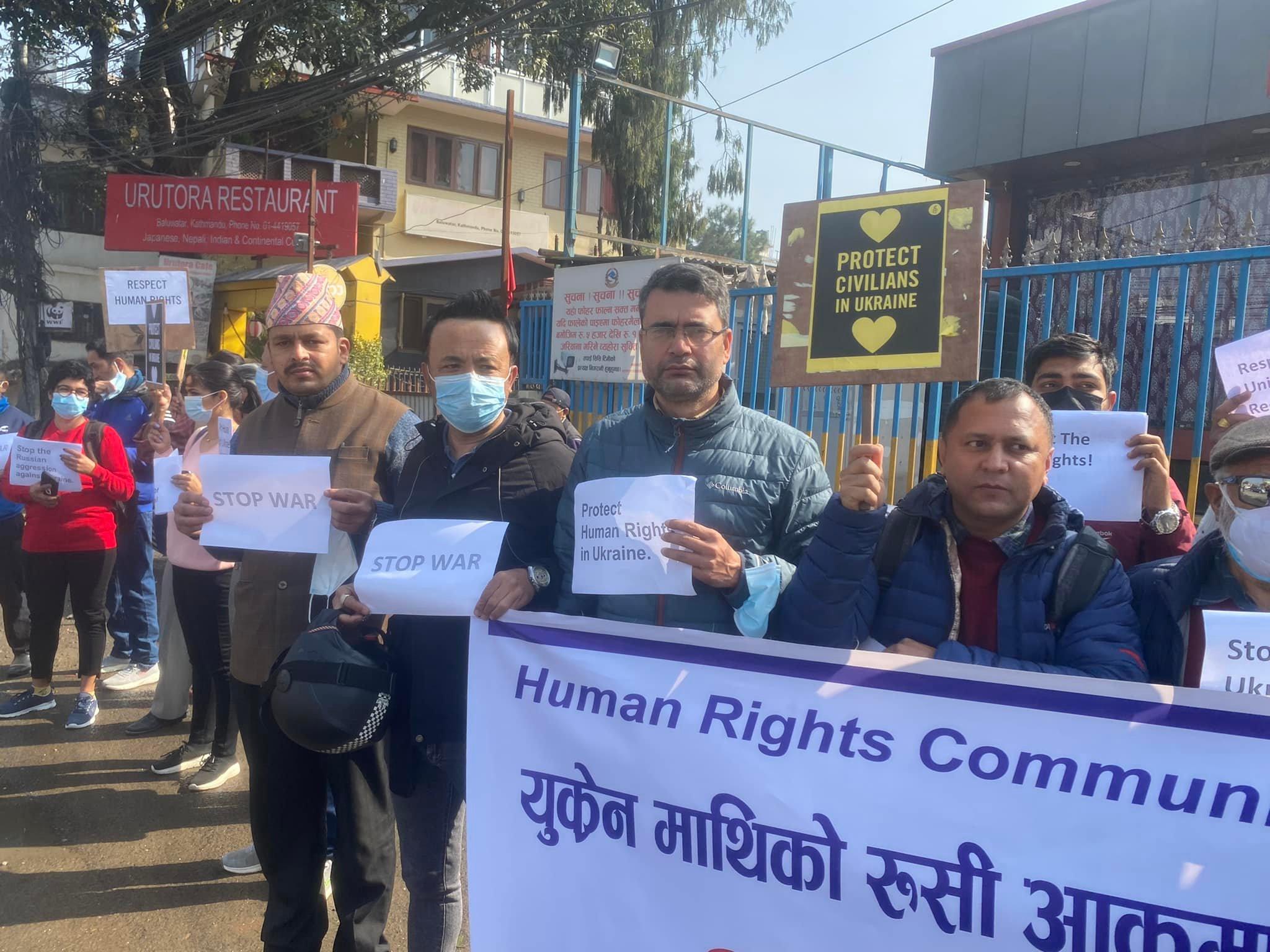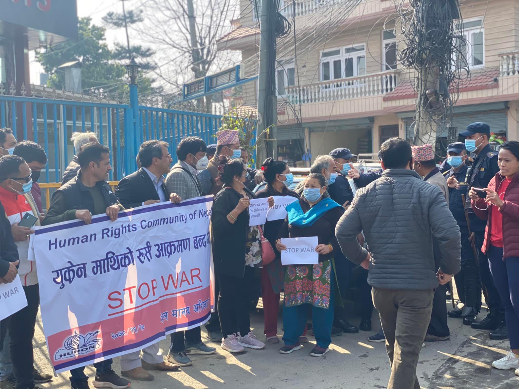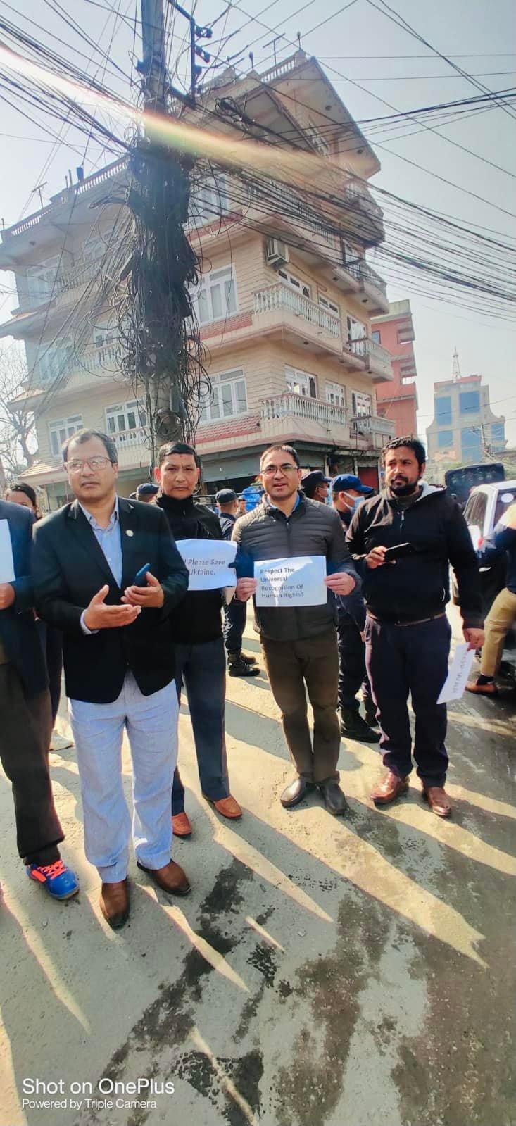 युक्रेन माथिको रुसी आक्रमण रोक्न र युद्ध पीड़ित सवैको मानवअधिकार रक्षाका लागि विश्व जनमत तयार गर्न नेपाल स्थित रुसी दुतावास अगाडि आयोजित शान्तिपूर्ण प्रदर्शन ०७८ फागुन २० गते शुक्रवार , विहान ९.३० वजे