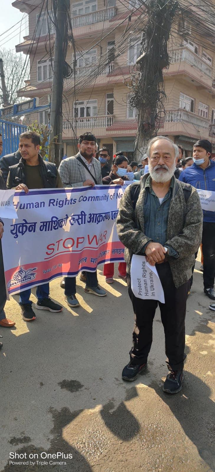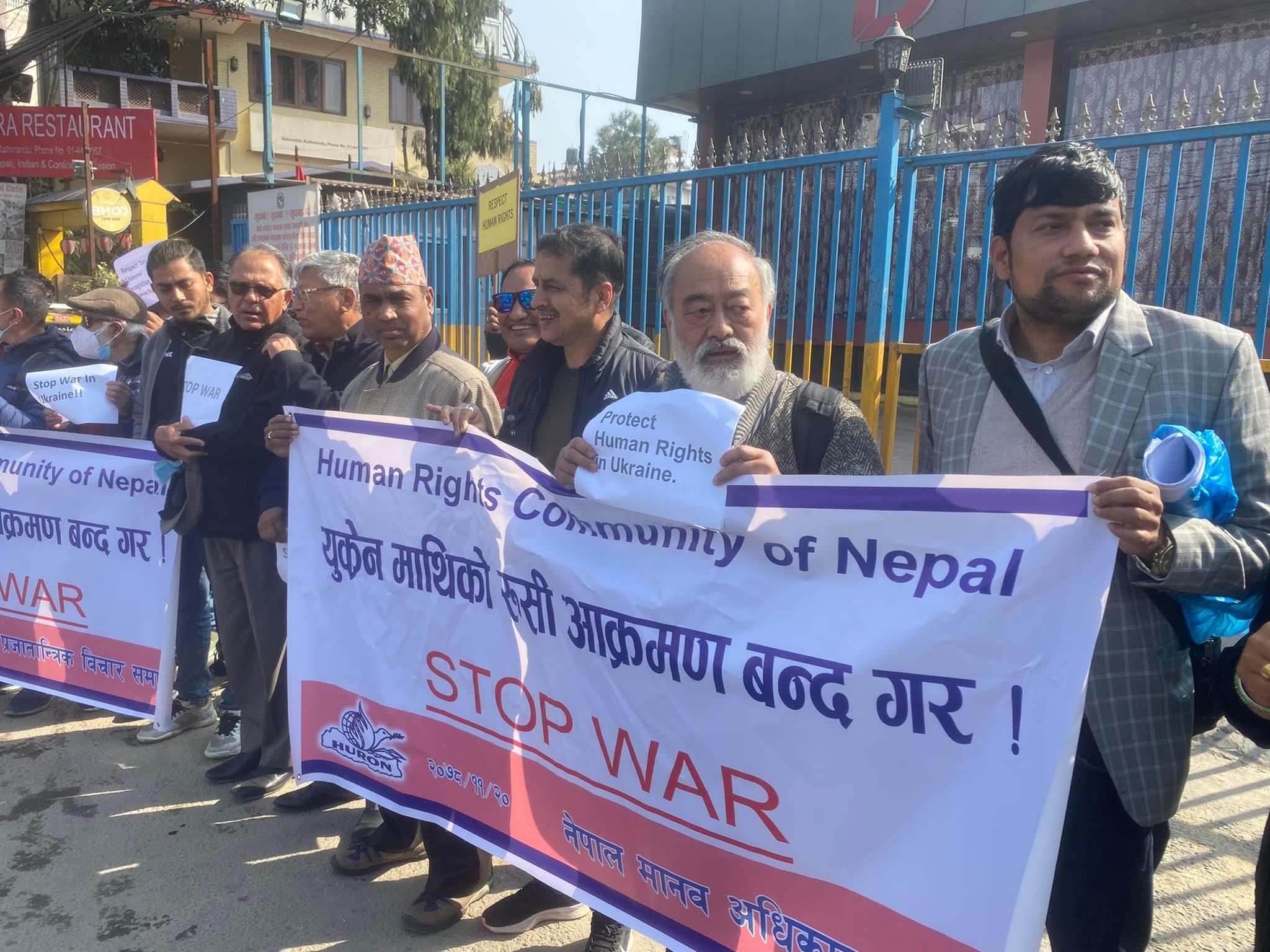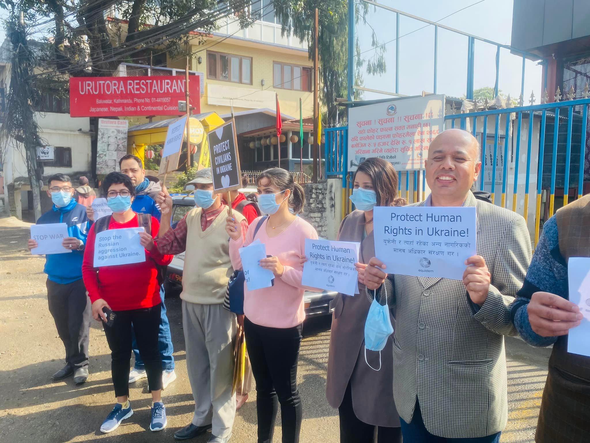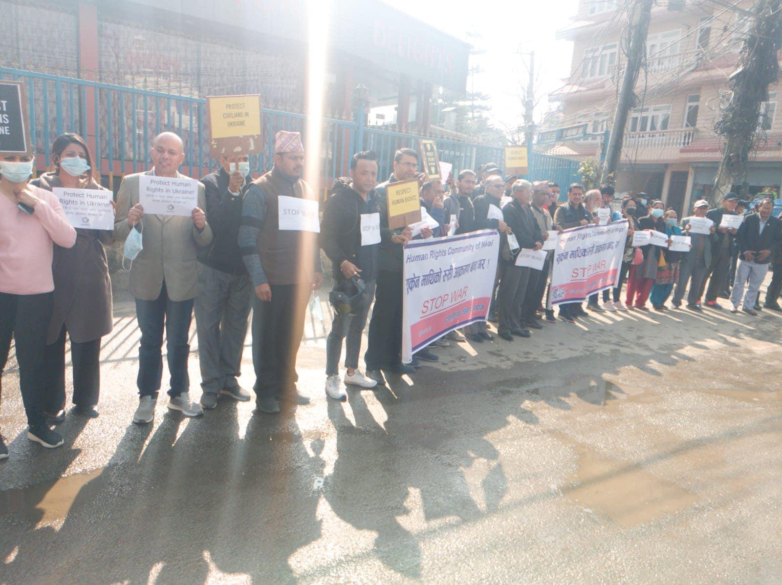 युक्रेन माथिको रुसी आक्रमण रोक्न र युद्ध पीड़ित सवैको मानवअधिकार रक्षाका लागि विश्व जनमत तयार गर्न नेपाल स्थित रुसी दुतावास अगाडि आयोजित शान्तिपूर्ण प्रदर्शन ०७८ फागुन २० गते शुक्रवार , विहान ९.३० वजे