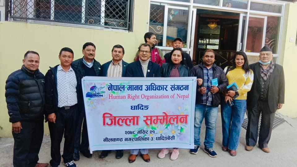 आज०७८ मंसिर ३१ गते नेपाल मानव अधिकार संगठन धादिगं शाखाको तेश्रो शाखा सम्मेलन सम्पन्न भयो । सम्मेलनने अधिवक्ता कृष्ण राज अधिकारी आगामी तिन वर्षका लागि शाखा सभापति मा चयन गर्यो र ९ सदस्यीय कार्यसमिति गठन गर्यो । साथै सभाले संगठनका पूर्व अध्यक्ष स्व. कृष्ण प्र दहाल र उपाध्यक्ष स्व. सिताराम वर्मा प्रति हार्दिक श्रद्धांजलि प्रकट गर्यो ।